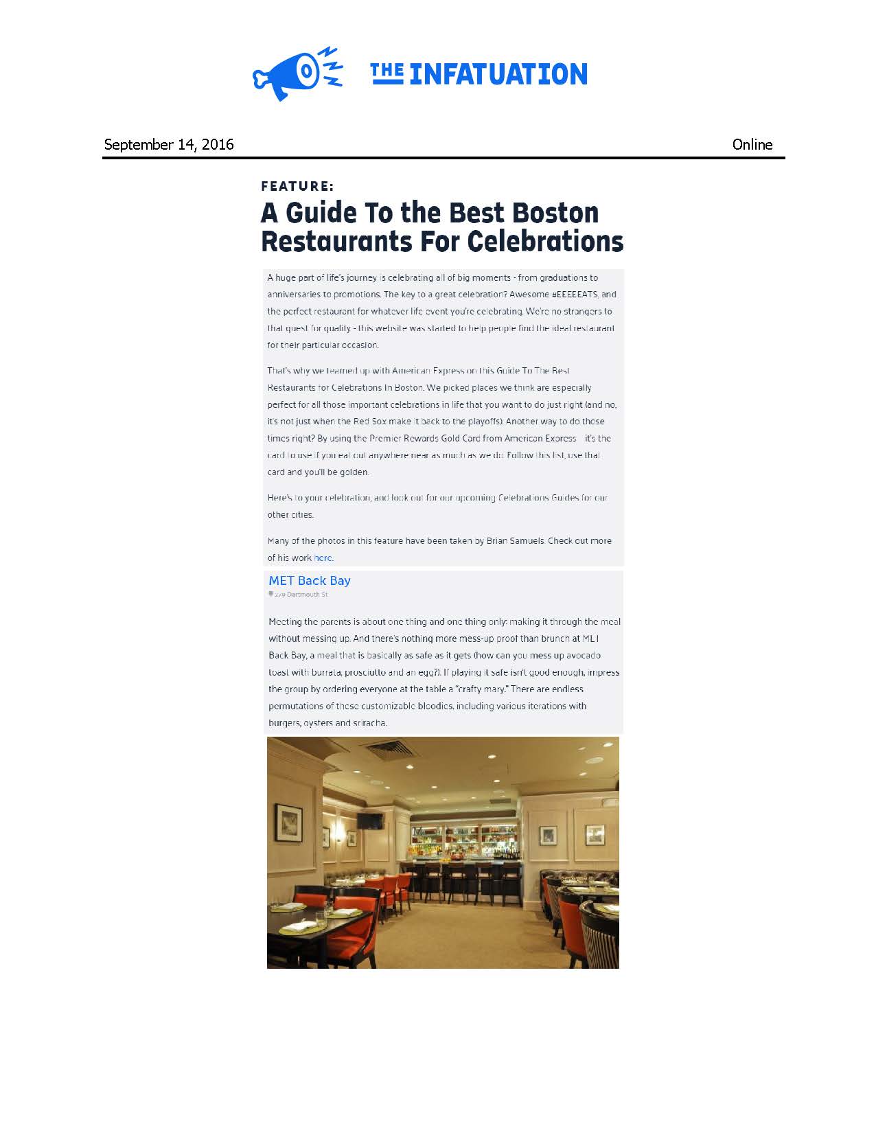 MET Back Bay, a restaurant by Kathy Sidell is located in the heart of Boston’s posh Back Bay neighborhood, MET Back Bay occupies an historic 1877 brick townhouse on the corner of Newbury and Dartmouth Streets. The space has been meticulously renovated and is modern, elegant and comfortable while paying homage to the classic style and timeless beauty of the building and surrounding neighborhood. MET Back Bay’s menu blends new American cooking with contemporary continental cuisine and embraces quintessential New England ingredients.